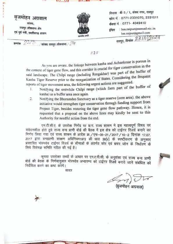 सांसद बृजमोहन अग्रवाल ने केंद्रीय वन मंत्री को लिखे पत्र में कहा था कि भोरमदेव अभ्यारण्य, जो कान्हा टाइगर रिजर्व के बफर क्षेत्र से जुड़ा हुआ है, वन्यजीव संरक्षण की दृष्टि से अत्यंत महत्वपूर्ण है। NTCA ने 28 जुलाई 2014 को इस क्षेत्र को टाइगर रिजर्व बनाने की अनुशंसा की थी। इसके बाद छत्तीसगढ़ राज्य वन्यजीव बोर्ड ने भी इसकी मंजूरी दी थी।