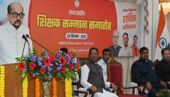 समारोह की अध्यक्षता कर रहे मुख्यमंत्री विष्णु देव साय ने कहा कि शिक्षक ही सच्चे राष्ट्र निर्माता होते हैं। वे देश को ऐसे राष्ट्रभक्त नागरिक देते हैं, जो आगे चलकर समाज और राष्ट्र की उन्नति में योगदान देते हैं। जिस प्रकार दीपक स्वयं जलकर दूसरों को प्रकाश देता है, उसी प्रकार शिक्षक भी अनेक कठिनाइयों के बावजूद ज्ञान का उजाला फैलाते हैं। उन्होंने कहा कि छत्तीसगढ़ राज्य अपनी स्थापना के 25 वर्ष पूरे कर रहा है और इस रजत जयंती वर्ष में प्रदेश ने हर क्षेत्र में उल्लेखनीय प्रगति की है। शिक्षा विकास का मूलमंत्र है और इसके बिना जीवन अधूरा है। पिछले वर्षों में शिक्षा के क्षेत्र में भी व्यापक विस्तार हुआ है। आज प्रदेश में 20 से अधिक विश्वविद्यालय, 15 से ज्यादा मेडिकल कॉलेज और राष्ट्रीय ख्याति प्राप्त संस्थान जैसे आईआईटी, आईआईएम, एम्स तथा लॉ विश्वविद्यालय स्थापित हैं।