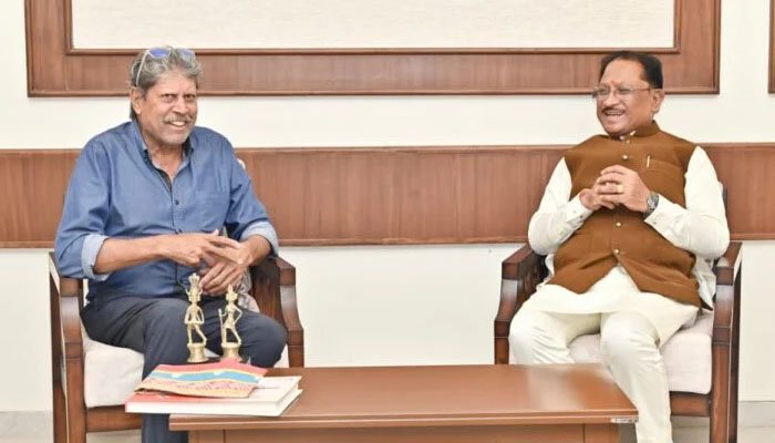 रायपुर : मुख्यमंत्री विष्णु देव साय से आज नया रायपुर स्थित मुख्यमंत्री निवास कार्यालय में भारतीय क्रिकेट टीम के पूर्व कप्तान कपिल देव ने सौजन्य मुलाकात की। मुख्यमंत्री ने कपिल देव को बेल मेटल से बनी प्रतिकृति, पुण्यभूमि छत्तीसगढ़ कॉफी टेबल बुक भेंट कर उनका अभिनंदन किया।