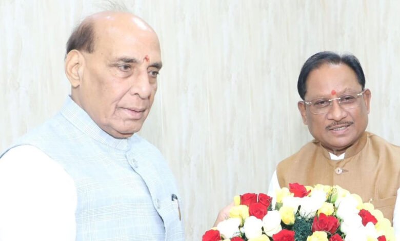 रायपुर : छत्तीसगढ़ के मुख्यमंत्री विष्णुदेव साय ने आज नई दिल्ली में केंद्रीय रक्षा मंत्री राजनाथ सिंह से उनके निवास पर सौजन्य मुलाक़ात की। बैठक में बिलासपुर एयरपोर्ट के विस्तार, रक्षा क्षेत्र के विकास, पूरे प्रदेश में सेना भर्ती रैलियों के आयोजन एवं नौसैनिक पोतों के नामकरण जैसे कई महत्वपूर्ण विषयों पर सार्थक चर्चा हुई। इस अवसर पर केंद्रीय आवासन एवं शहरी कार्य राज्यमंत्री तोखन साहू और मुख्यमंत्री के प्रमुख सचिव सुबोध कुमार सिंह भी उपस्थित थे।