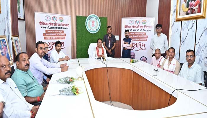 मुख्यमंत्री साय ने जशपुर जिले के बगिया ग्राम में मुख्यमंत्री कैंप कार्यालय से वर्चुअल माध्यम से जशपुर विकासखंड के ग्राम आरा, पत्थलगांव विकासखंड के ग्राम कुडे़केला (घरजियाबथान) और बगीचा विकासखंड के ग्राम छिछली में छत्तीसगढ़ राज्य ग्रामीण बैंक की नई शाखाओं का लोकार्पण किया। इस अवसर पर उन्होंने छत्तीसगढ़ राज्य ग्रामीण बैंक के 12वें वार्षिक प्रतिवेदन का भी विमोचन किया।