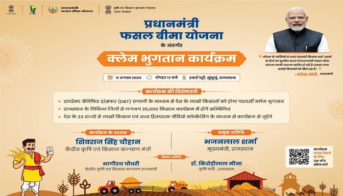प्रधानमंत्री फसल बीमा योजना के अंतर्गत यह भुगतान 11 अगस्त 2025 (सोमवार) को राष्ट्रव्यापी प्रत्यक्ष लाभ हस्तांतरण आधारित स्वचालित प्रणाली के माध्यम से केंद्रीय कृषि एवं किसान कल्याण मंत्री श्री शिवराज सिंह चौहान की अध्यक्षता में राजस्थान के झुंझुनू में आयोजित कार्यक्रम में होगी। इस अवसर पर आयोजित कार्यक्रम के मुख्य अतिथि राजस्थान के मुख्यमंत्री श्री भजनलाल शर्मा होंगे। कार्यक्रम में केन्द्रीय कृषि एवं किसान कल्याण मंत्री श्री भागीरथ चौधरी, राजस्थान के कृषि मंत्री डॉ. किशोरी लाल मीना विशिष्ट अतिथि होंगे।